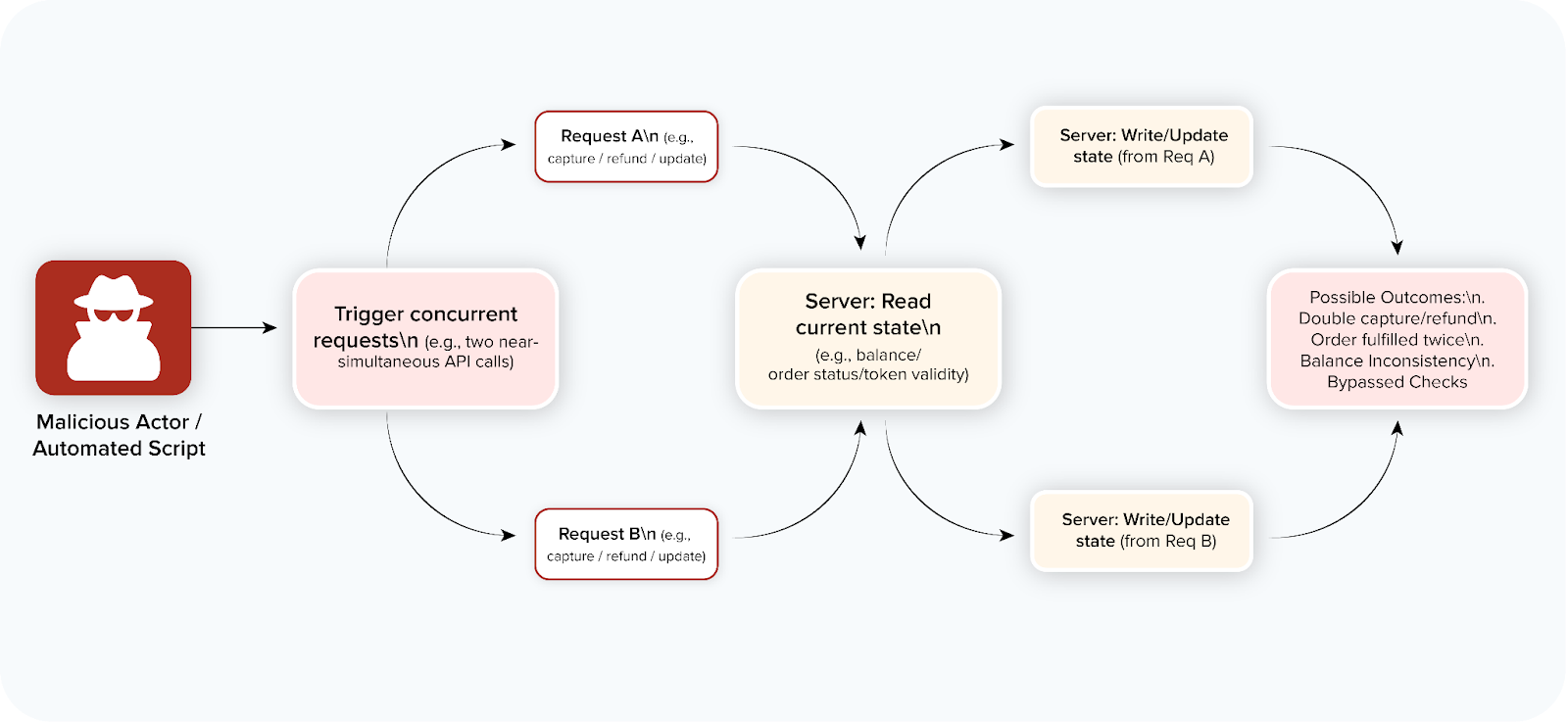 - Race conditions: These occur when two or more processes interact with a shared resource concurrently. In a payment flow, an attacker might simultaneously trigger a transaction and a refund or manipulate order status updates.